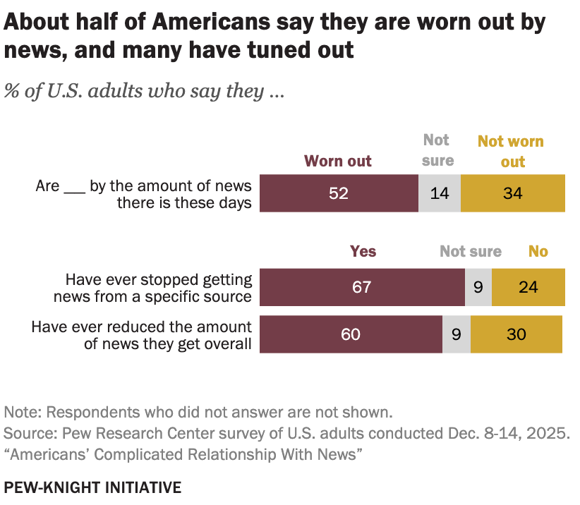 Nearly a quarter say they do it only because they feel like they should. About half say it’s some mix of both. And 16% say they don’t follow the news at all. The country that invented the 24-hour news cycle has mostly stopped enjoying what it produces. Six in 10 have reduced how much news they consume overall. Two-thirds have dropped a specific source entirely. And yet, eight in 10 Americans still say people have a civic responsibility to be informed when they vote. They believe in the idea of an informed public. They’re just exhausted by the experience of trying to be one.